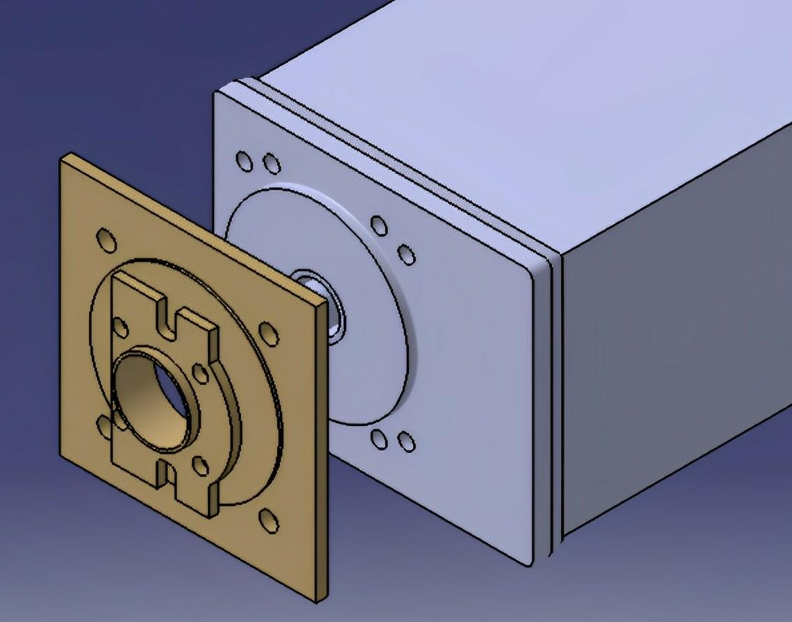 L’assemblage du système nécessite une bride de fixation du moteur sur le réducteur, une platine pour fixer l’ensemble moto-réducteur sur le magasin de carton et une clavette pour la transmission de couple.